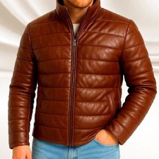 Men’s Brown Leather Puffer Jacket Genuine Lambskin Winter Coat