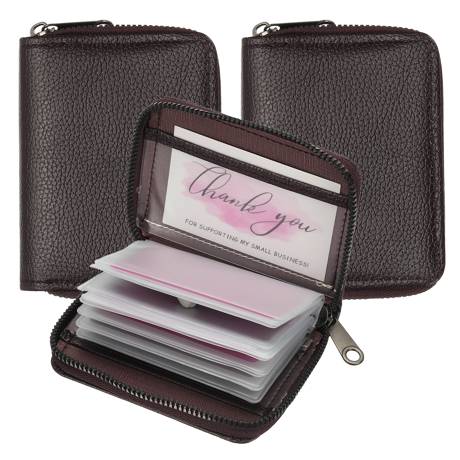 2Pcs Leather Credit Card Holder Zipper Wallet, Coffee(Dual-sided)