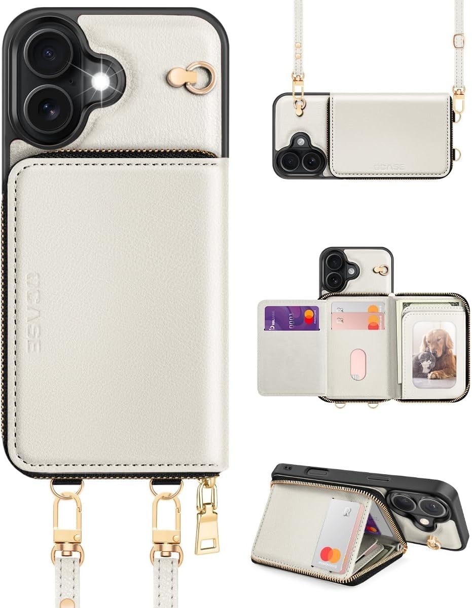 OCASE for iPhone 16 Case, PU Leather Crossbody Zipper Wallet Case with Wrist Str