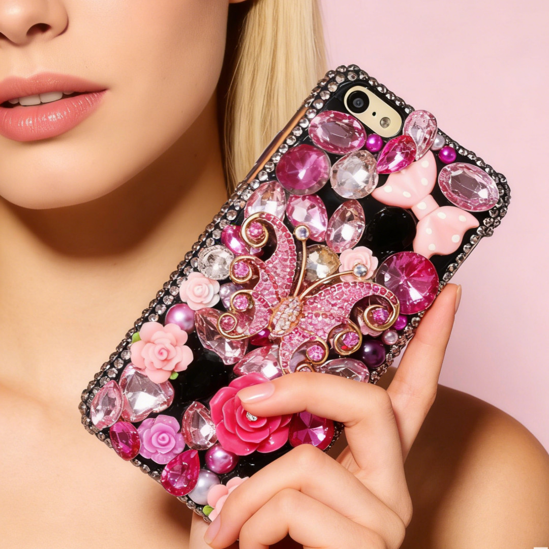 3D Bling Sparkly Pink Butterfly Case Handmade Diamonds Crystals Soft Phone Cover