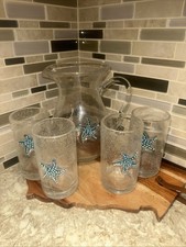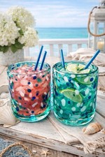 Hand Blown Coastal Glass Tumblers Set of 4 Aqua Blue Seahorse Starfish Art Glass