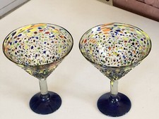 3 Mexican Hand Blown Martini Margarita Glasses With Turqoise Aqua Rim & Base