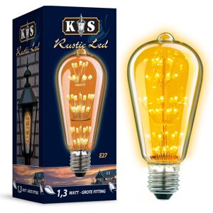 Deze energiezuinige 1,3 watt LED lamp vervangt de traditionele 15 watt gloeilamp.Vind je een ouderwetse peervormige gloeilamp ook zo'n mooie gezellige sfeer geven, maar wil je een duurzame en energiezuinige lichtbron toepassen? Dan is de Rustic LED lamp de juiste keuze. De Rustic LED lamp is geschikt voor alle buitenverlichting en tuinverlichting met een E27 fitting (lamphouder). Deze LED lamp heeft energieklasse E. Is dus zeer energiezuinig, bovendien is het een duurzame LED lamp met een gemiddelde levensduur van 15000 uren. De Rustic LED geeft een prachtig warm licht, 2100 Kelvin, 150 lumen en is slechts 1,3 Watt. Een trendy modern alternatief voor de klassieke nostalgische gloeilamp. Deze LED lichtbron heeft een hoogte van 14 cm en een breedte van 6 cm.Het voordeel van een LED lamp is de lange levensduur, de geringe warmteafgifte en een LED lamp is zeer energiezuinig. In tegenstelling tot een spaarlamp brandt een LED lamp direct op volle sterkte. Deze Rustica LED lamp is zeer bijzonder vanwege het mooie warme licht, vergelijkbaar met een gloeilamp.De KS Rustic LED heeft helder glas, de kleur of de foto geeft een goede indruk van de warmte van het licht.